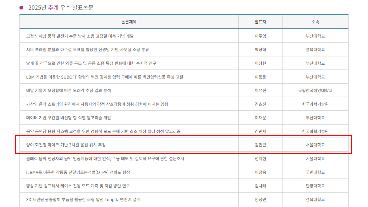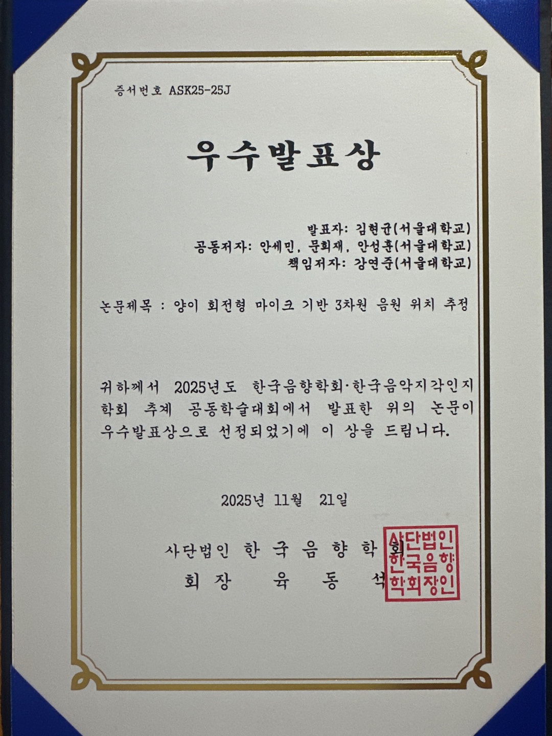 2025년도 한국음향학회·한국음악지각인지학회 추계공동학술대회에서 우수발표상으로 김현균 학생이 선정되었습니다.